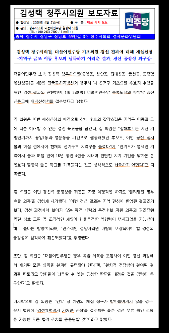 김 의원은 “상대후보는 지난 지방선거까지 용암1동과 영운동을 기반으로 활동해왔던 후보로, 이번 공천 심사 불과 며칠 전 현재의 선거구로 지역구를 옮겼다”며 “이번 경선 결과는 지역 민심이 반영된 결과라기보다 경선 과정에서 보이지 않는 특정세력의 특정후보 지원 의혹과 권리당원 명단 상호 교환 등 조직적인 개입이나 불공정한 영향력이 행사되었을 가능성이 매우 높다는 방증”이라고 주장했습니다.