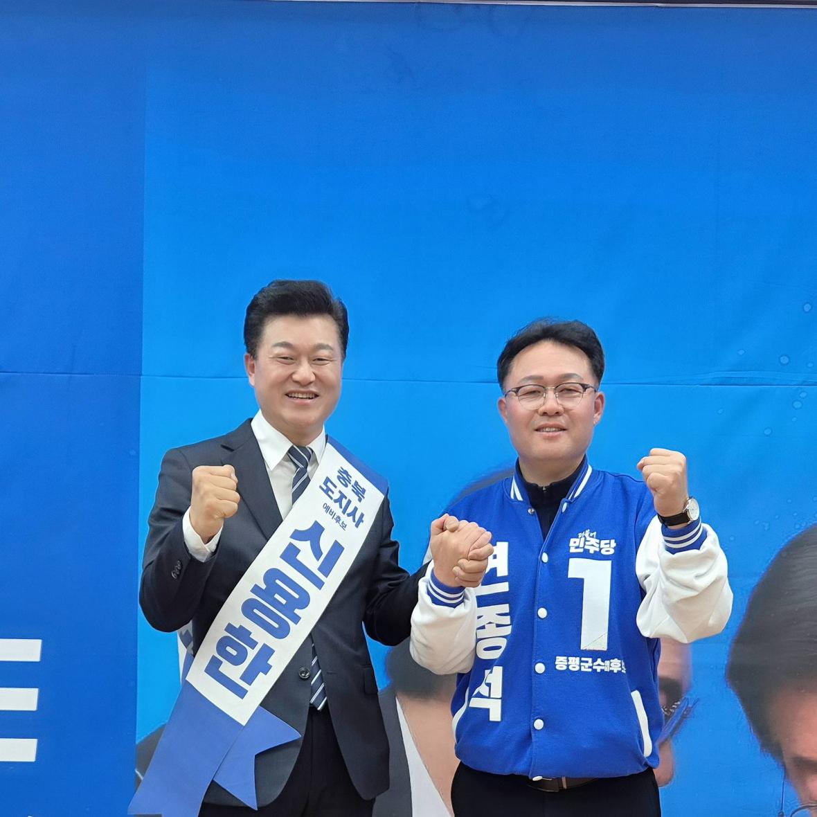 4일 연종석 증평군수 예비후보(오른쪽)가 신용한 민주당 충북지사 후보와 기념촬영을 하고 있다./연종석 페이스북