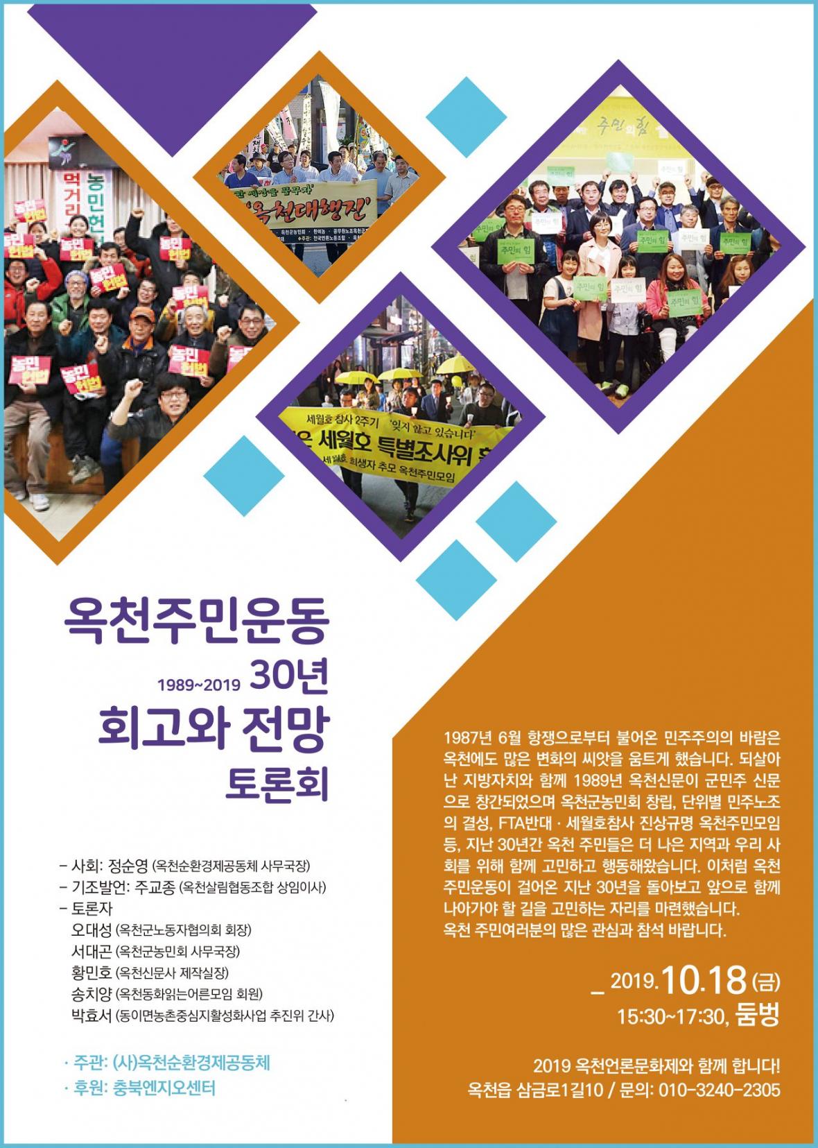 (사)옥천순환경제공동체는 오는 18일 오후 3시 30분부터 ‘옥천주민운동 30년 회고와 전망 토론회’를 옥천읍 둠벙에서 개최한다.