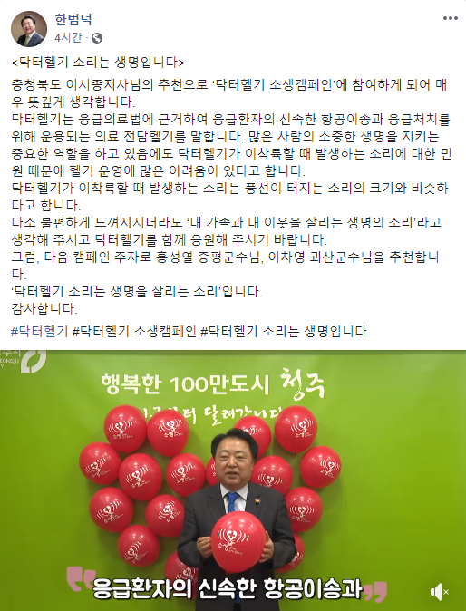 한 시장은 17일 ‘닥터헬기 소생 캠페인’관련 영상을 페이스북에 올렸다.