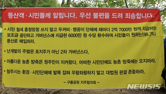 청주시 서원구 성화동 구룡공원 토지주들은 17일 오후 사유지인 공원 등산로에 장기미집행 도시계획시설 자동실효를 판결한 헌법재판소의 결정을 존중할 것을 주장하는 현수막을 달았다. /뉴시스