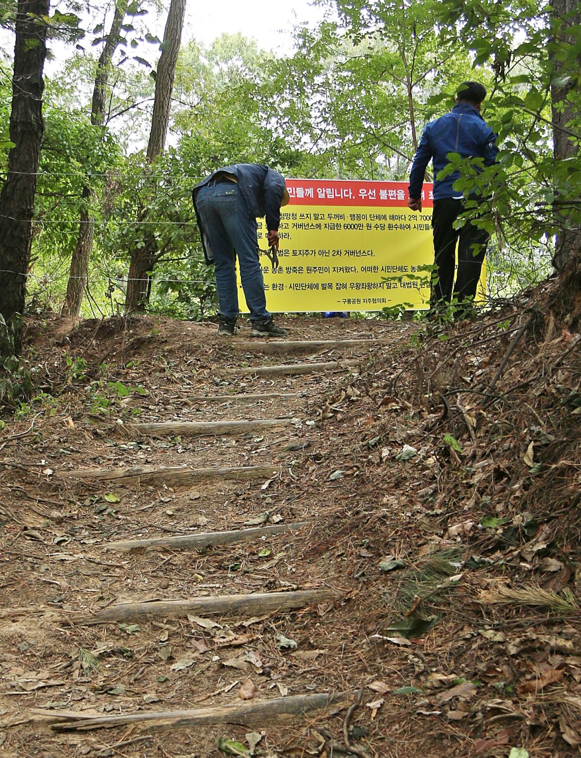 지난 10일 같은 장소에 '등산로 폐쇄'를 안내하는 현수막을 내건 데 이어 두 번째 '현수막 투쟁'이다.