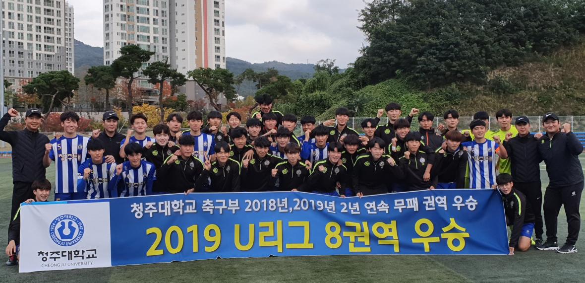 청주대는 지난 18일 청주대 축구 전용구장에서 열린 홈경기에서 위덕대를 5대2 누르고 9개 대학팀이 속해있는 2019 U리그 8권역에서 12승 3무로 권역 우승을 확정했다.