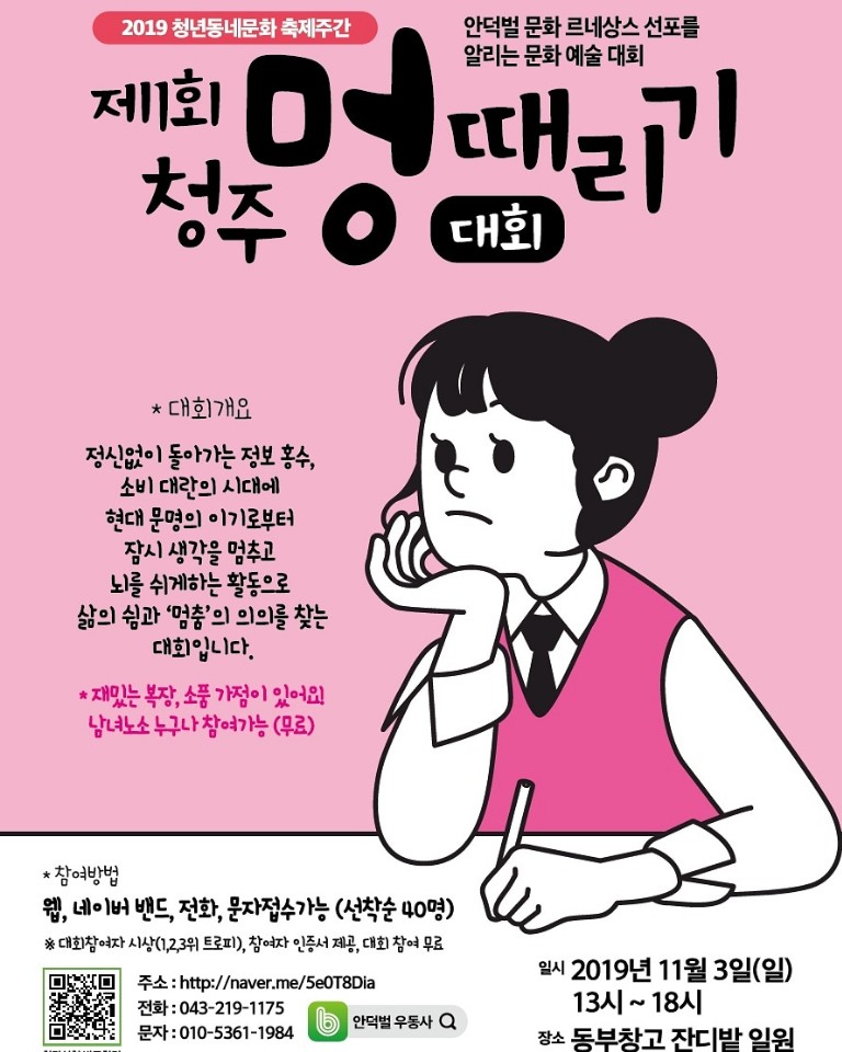 청년뜨락5959 등이 주최하는 이번 청주멍때리기대회는 선착순으로 접수한 40명이 참여할 수 있으며, 멍하게 있으면 된다.