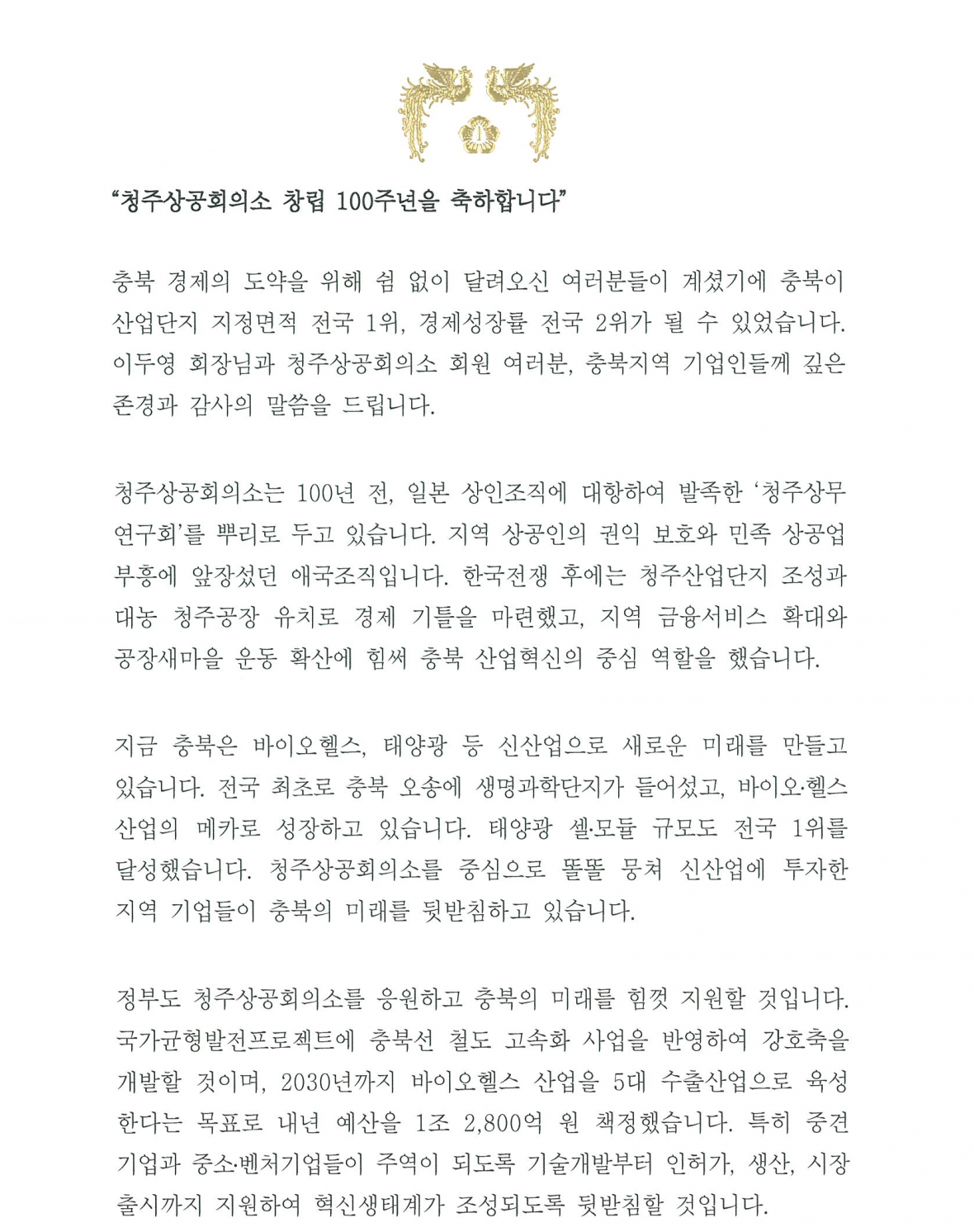 문재인 대통령 청주상공회의소 창립 100주년 축하메시지.
