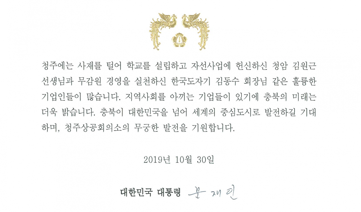 문 대통령은 메시지에서 “청주상공회의소는 100년전 일본 상인조직에 대항해 발족한 ‘청주상무연구회’를 뿌리로 두고 있다‘면서 ”지역 상공인의 권익보호와 민족상공업 부흥에 앞장섰던 애국조직“이라고 밝혔다.