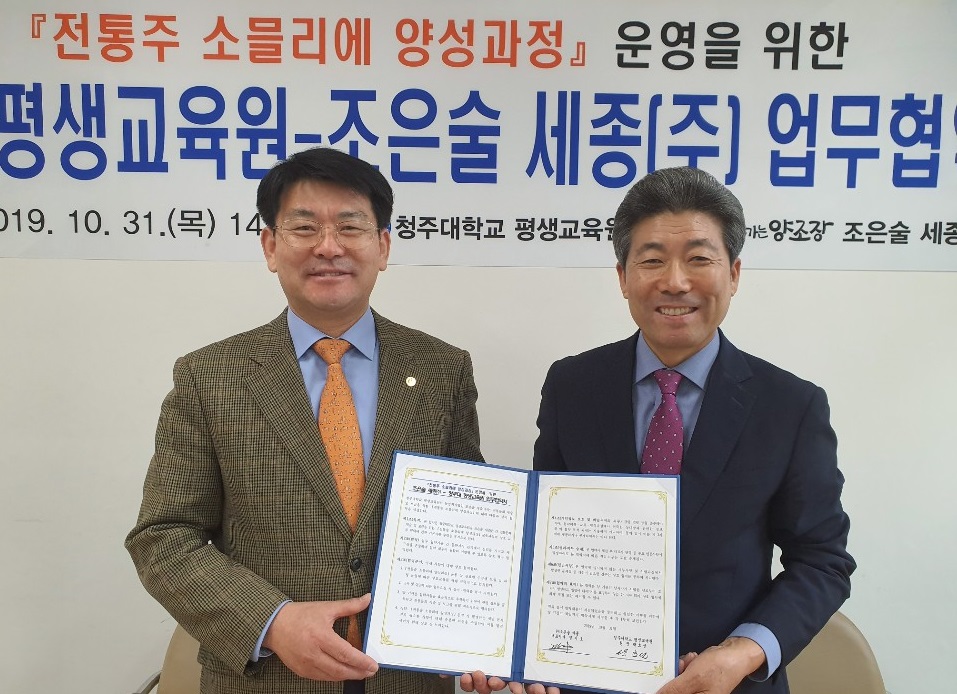 박효선 청주대 평생교육원장(왼쪽)과 경기호 조은술세종(주) 대표.