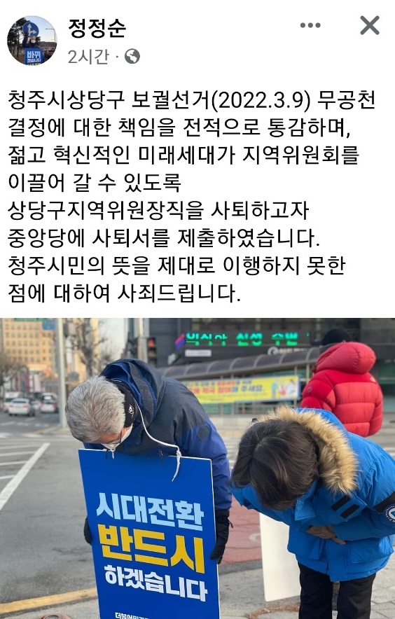정 전 의원은 29일 오전 자신의 페이스북에 “청주상당구 무공천 결정에 대한 책임을 전적으로 통감하며, 젊고 혁신적인 미래세대가 지역위원회를 이끌어갈 수 있도록 상당구지역위원장직을 사퇴하고자 중앙당에 사퇴서를 제출했다”고 썼다.