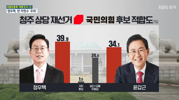 한편, KBS청주가 실시한 국민의힘 후보 적합도 조사에서 정우택 39.9%, 윤갑근 34.1%로 두 예비후보의 격차가 오차범위 안까지 좁혀졌다.