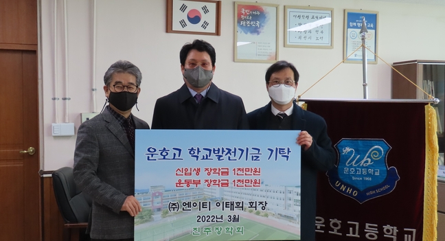이태희 (주)엔이티 회장(가운데)이 2일 운호고에서 장학금 2000만원을 박균하 교장(왼쪽)에게 기탁하고 있다.