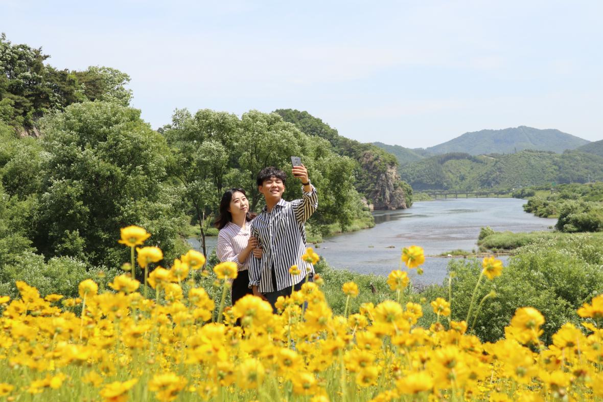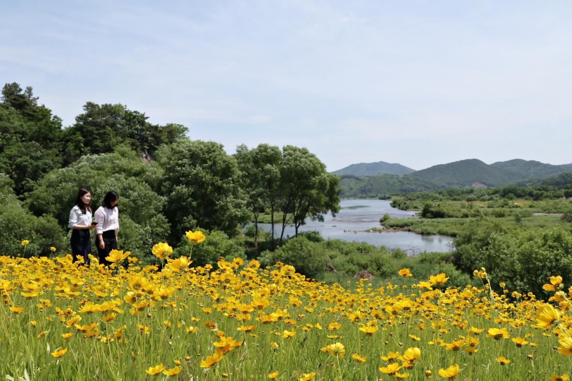 구간의 둔치에 활짝핀 금계국이 지나는 이들의 발길을 잡고 있다