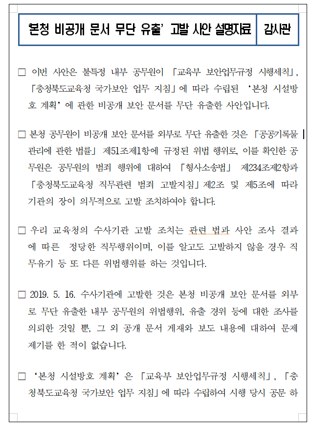 도교육청은 또“수사기관에 고발한 것은 본청 비공개 보안 문서를 외부로 무단 유출한 내부 공무원의 위법행위, 유출 경위 등에 대한 조사를 의뢰한 것일 뿐, 그 외 공개 문서 게재와 보도 내용에 대하여 문제 제기를 한 적이 없다”고 밝혔다.