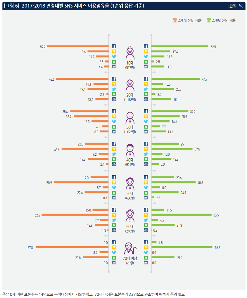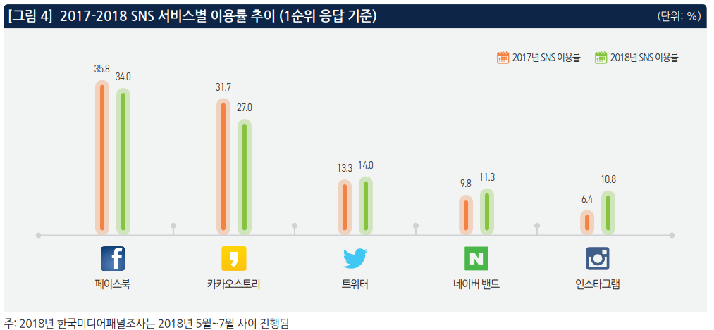 특히 SNS 서비스별 이용률은 페이스북(34.0%)이 가장 높았으며, 카카오스토리(27.0%), 트위터(14.0%), 네이버 밴드(11.3%), 인스타그램(10.8%) 순으로 나타났다.