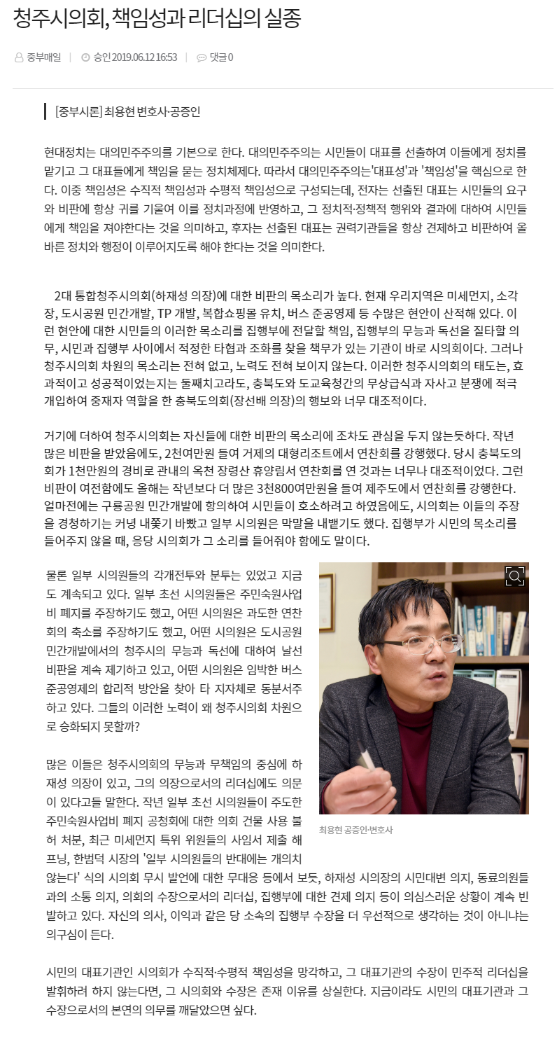 최 변호사는 12일 중부매일신문의 칼럼 ‘중부시론’에 ‘청주시의회, 책임성과 리더십의 실종’이라는 글을 올렸다.