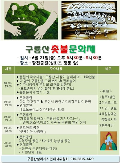 구룡산살리기시민대책위원회가 주최하는 이번 촛불문화제는 150인분의 국수나누기, 청주시장에게 의견 말하기, 문화공연, 샌드아트 공연 등 시민들의 자발적인 촛불집회로 자리잡고 있다.