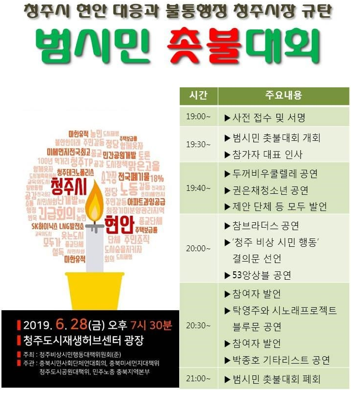 이날 범시민 촛불대회는 청주비상시민행동대책위원회 준비위원회가 주최하고 충북시민사회단체연대회의, 충북미세먼지대책위원회, 청주도시공원대책위원회, 민주노총 충북지역본부가 주관한다.