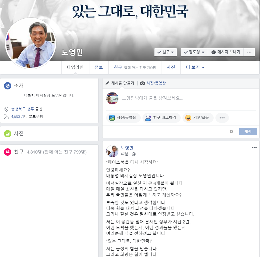 노 비서실장은 또 “저는 이 공간을 빌어 문재인 정부가 지난 2년, 어떤 노력을 했는지, 어떤 성과들을 냈는지 여러분께 직접 전하려고 합니다”라면서 페이스북 재개의 이유를 설명했다.