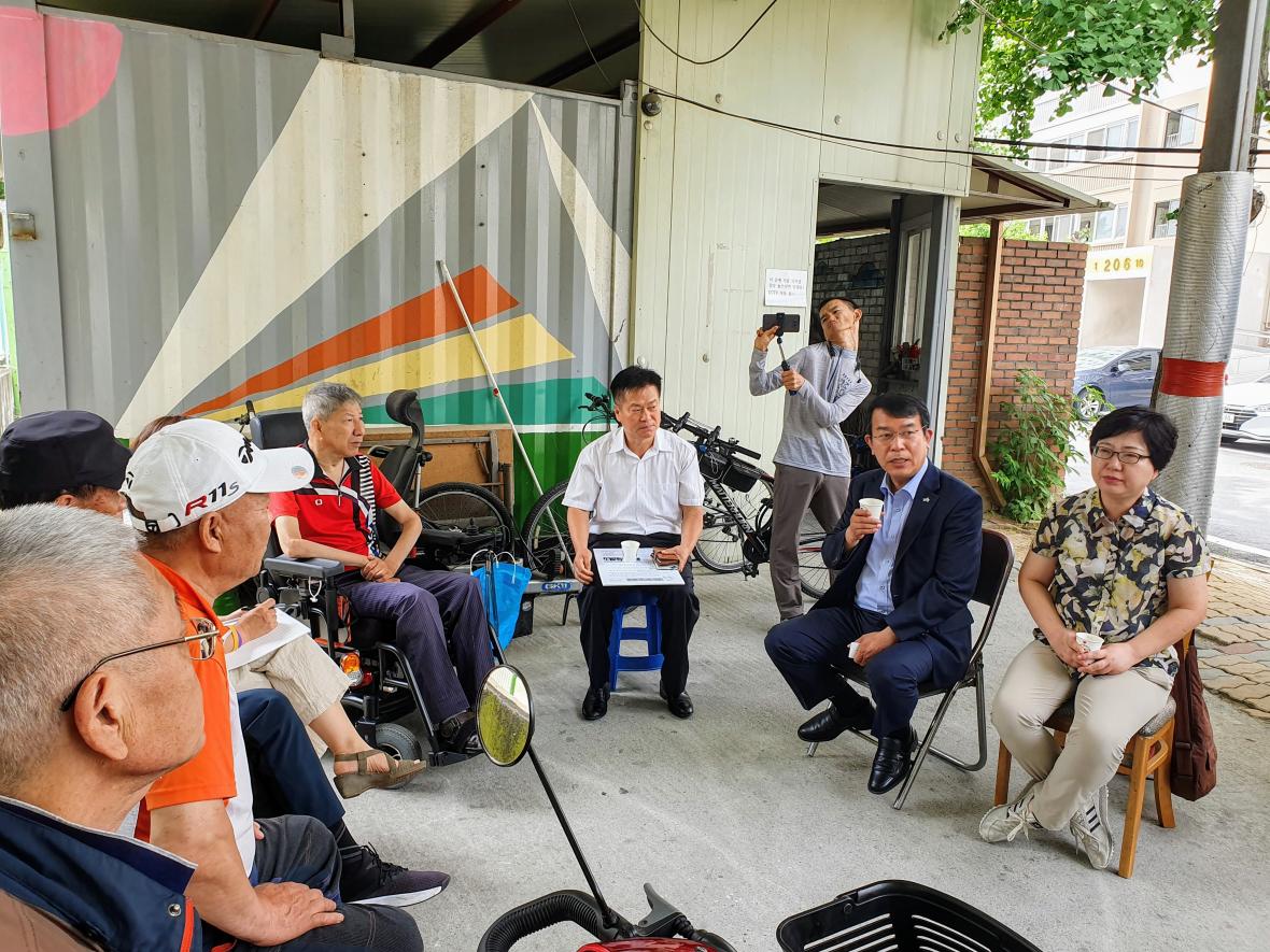 철거 예정인 현 쉼터 앞에서 새 쉼터 설치계획에 대해 이야기를 나우고 있다. 오른쪽부터 앉은 순서대로 이인선 정의당 청주시지역위원장, 김종대 국회의원, 남상섭 LH 부장, 민영의 사랑의 쉼터 대표.