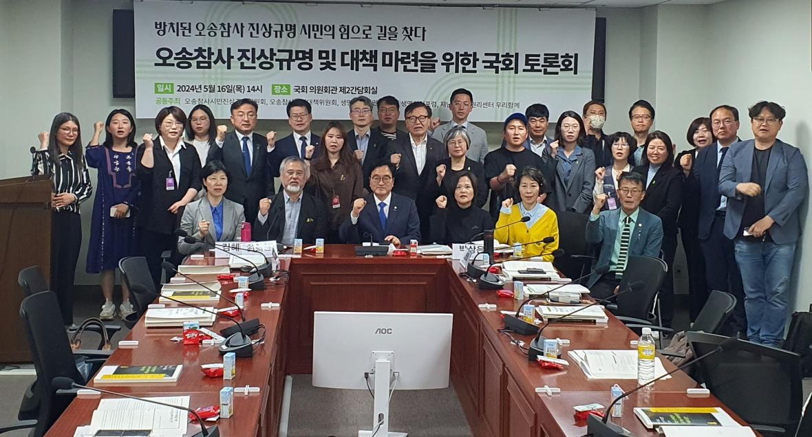 민주당 우원식 국회의장 후보(앞줄 가운데) 등이16일 국회에서 열린 오송참사 진상규명 국회토론회에서 진상규명을 다짐하고 있다./서울=소셜미디어 태희
