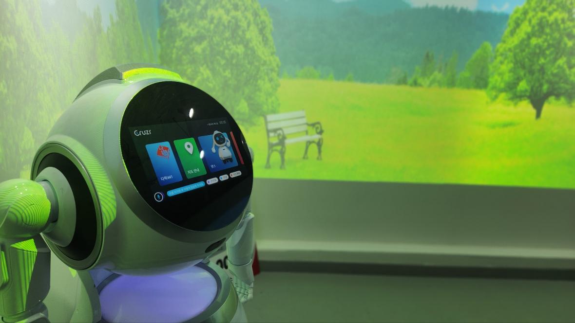 유제완 채움플러스 대표(오른쪽)이 우암담빛루 로봇체험에 대해 설명하고 있다./미디어 태희