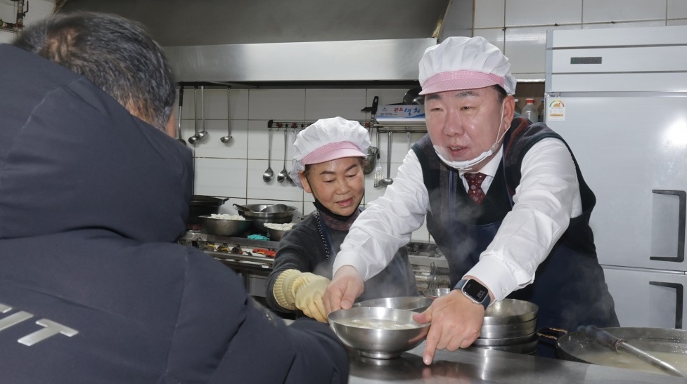 이범석 청주시장이 24일 청주시일자리종합지원센터에서 구직자들에게 떡국 배식 서비스를 하고 있다./청주시 제공
