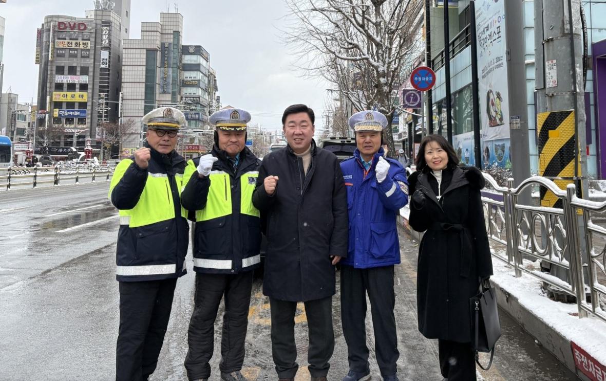 이범석 청주시장(가운데)이 지난 28일 교통봉사자들을 격려한뒤 기념촬영을 하고 있다./청주시 제공