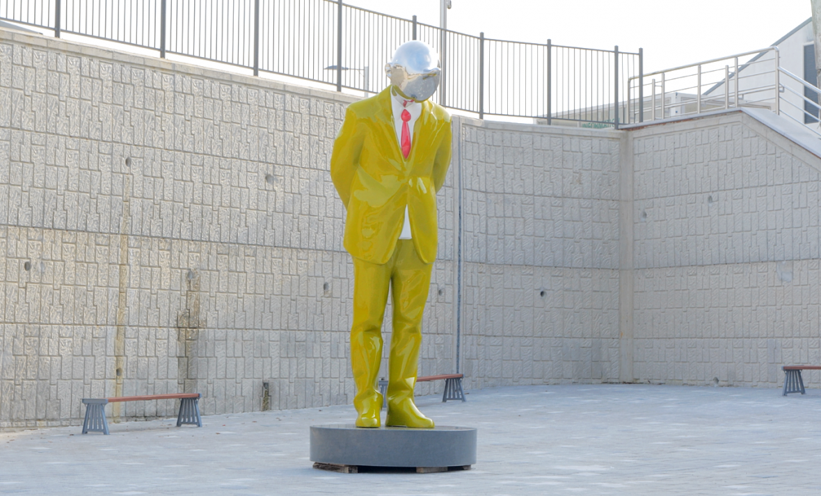 이 작품은 높이가 380cm에 이를 정도로 크고 연두색 상하의에 헬멧을 쓴 사람이 무언가 생각에 잠겨 있는 모습으로 만들어졌다.
